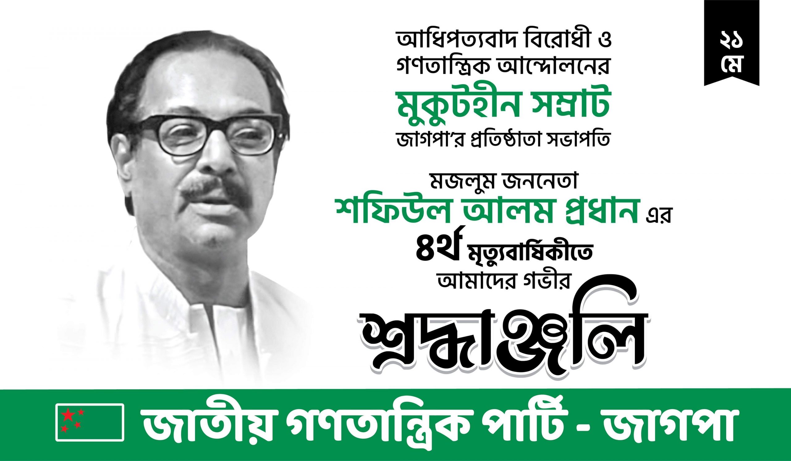 জাতীয় গণতান্ত্রিক পার্টি জাগপা’র প্রতিষ্ঠাতা সভাপতি শফিউল আলম প্রধান এর ৪র্থ মৃত্যুবার্ষিকী আগামীকাল। ২০১৭ সালের ২১ মে সকাল ০৭ টায় হৃদযন্ত্রের ক্রিয়া বন্ধ হয়ে তিনি ইন্তেকাল করেন। শফিউল আলম প্রধানের জন্ম ১৯৪৯ সালের পহেলা জানুয়ারি পঞ্চগড়ে। তিনি তৎকালীন প্রাদেশিক পাকিস্তানের আইন পরিষদের স্পীকার এড. মৌলভী গমির উদ্দিন প্রধানের ৩য় ছেলে। ১৯৬৮ সালে শেখ বোরহানউদ্দিন কলেজের নির্বাচিত জিএস এবং ১৯৭০ সালে ঢাকা বিশ্ববিদ্যালয়ের সলিমুল্লাহ হলের ভিপি নির্বাচিত হন তিনি। ঢাকা বিশ্ববিদ্যালয়ের সমাজবিজ্ঞান বিভাগে পড়া অবস্থায় বাংলাদেশ ছাত্রলীগের গ্রন্থনা ও প্রকাশনা সম্পাদক ছিলেন। ১৯৭২-৭৩ সালে বাংলাদেশ ছাত্রলীগের সাংগঠনিক সম্পাদক এবং ১৯৭৪ সালে ছাত্রলীগের কেন্দ্রীয় সাধারণ সম্পাদক নির্বাচিত হন। ১৯৭৪ সালের ৩০ মার্চ ছাত্রলীগের পক্ষে ক্ষমতাসীনদের দুর্নীতির তালিকা প্রকাশ করে গ্রেফতার হন। ১৯৭৮ সালে কারাগার থেকে মুক্তি পেয়ে ১৯৮০ সালের ৬ এপ্রিল জাতীয় গণতান্ত্রিক পার্টি- জাগপা গঠন করেন। এই জাগপার ব্যানারে তিনি দেশ মাটি ও মানুষের অধিকার আদায়ের আন্দোলনে ঝাপিয়ে পড়েন। আগ্রাসনবিরোধী এবং দেশের প্রতিটি গণতান্ত্রিক আন্দোলনে তিনি রাজপথে ছিলেন। দেশের স্বাধীনতা-সার্বভৌমত্ব, তিস্তার পানি, দহগ্রাম আংগুরপোতা লংমার্চ, টিপাইমুখ বাঁধের বিরোধিতা, বেরুবাড়ী লংমার্চ, ইয়াসমিন হত্যা আন্দোলন, সীমান্ত হত্যাসহ নানাবিধ ইস্যু নিয়ে বছরের পর বছর আন্দোলন করেছেন। এ জন্য প্রতিটি সরকারের শাসনামলেই তাকে কারাগারে যেতে হয়েছে।