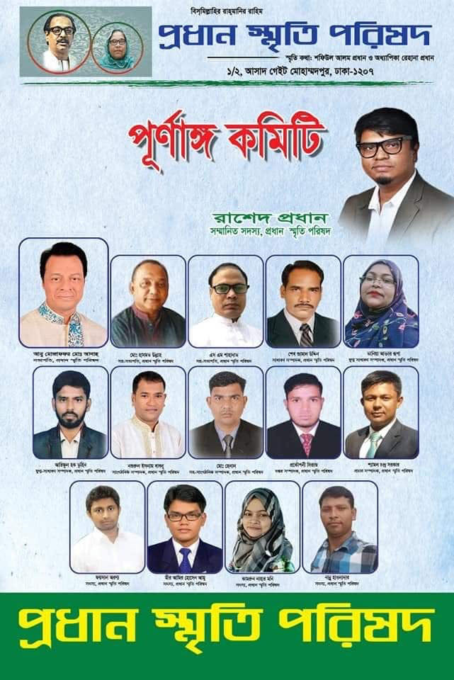 “প্রধান স্মৃতি পরিষদ” এর সভাপতি হিসেবে আবু মোজাফফর মো: আনাস এবং সাধারন সম্পাদক হিসেবে শেখ জামাল উদ্দিন এর সাথে দায়িত্ব গ্রহণ করেন সহ-সভাপতি পদে মো: হাসমত উল্লাহ এবং এস এম শাহাদাত, যুগ্ম সাধারণ সম্পাদক পদে তানিয়া আক্তার রুপা এবং আরিফুল হক তুহিন, সাংগঠনিক সম্পাদক পদে নজরুল ইসলাম বাবলু, সহ-সাংগঠনিক সম্পাদক পদে মো: হেলাল, দপ্তর সম্পাদক পদে প্রকৌশলী সিরাজ, প্রচার সম্পাদক পদে শ্যামল চন্দ্র সরকার, সদস্য হিসেবে ফয়সাল অরণ্য, মীর আমির হোসেন আমু, কমরুন নাহার মনি এবং নান্নু হাওলাদার| এছারাও সন্মানিত সদস্য হিসেবে দায়িত্ব গ্রহণ করেন রাশেদ প্রধান| এ সময় উপস্থিত জাগপা’র ভারপ্রাপ্ত সাধারন সম্পাদক আসাদুর রহমান খান, যুগ্ম সাধারণ সম্পাদক অধ্যাপক ইকবাল হোসেন সহ জাগপা’র কেন্দ্রীয় নেত্রীবৃন্দ “প্রধান স্মৃতি পরিষদ” এর সফলতা কামনা করেন|