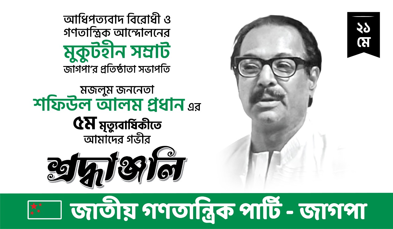 বিএনপি নেতৃত্বাধীন বিশ দলীয় জোটের অন্যতম রুপকার ও আধিপত্যবাদ বিরোধী আন্দোলনের আপোষহীন রাজনীতিবিদ, জাতীয় গণতান্ত্রিক পার্টি জাগপা’র প্রতিষ্ঠাতা সভাপতি শফিউল আলম প্রধানের আগামীকাল (২১মে ২০২২) ৫ম মৃত্যুবার্ষিকী। ২০১৭ সালের এই দিনে তিনি হৃদযন্ত্রের ক্রিয়া বন্ধ হয়ে আসাদগেট নিজ বাসায় ইন্তেকাল করেন।