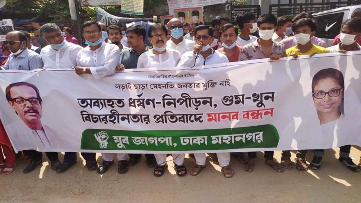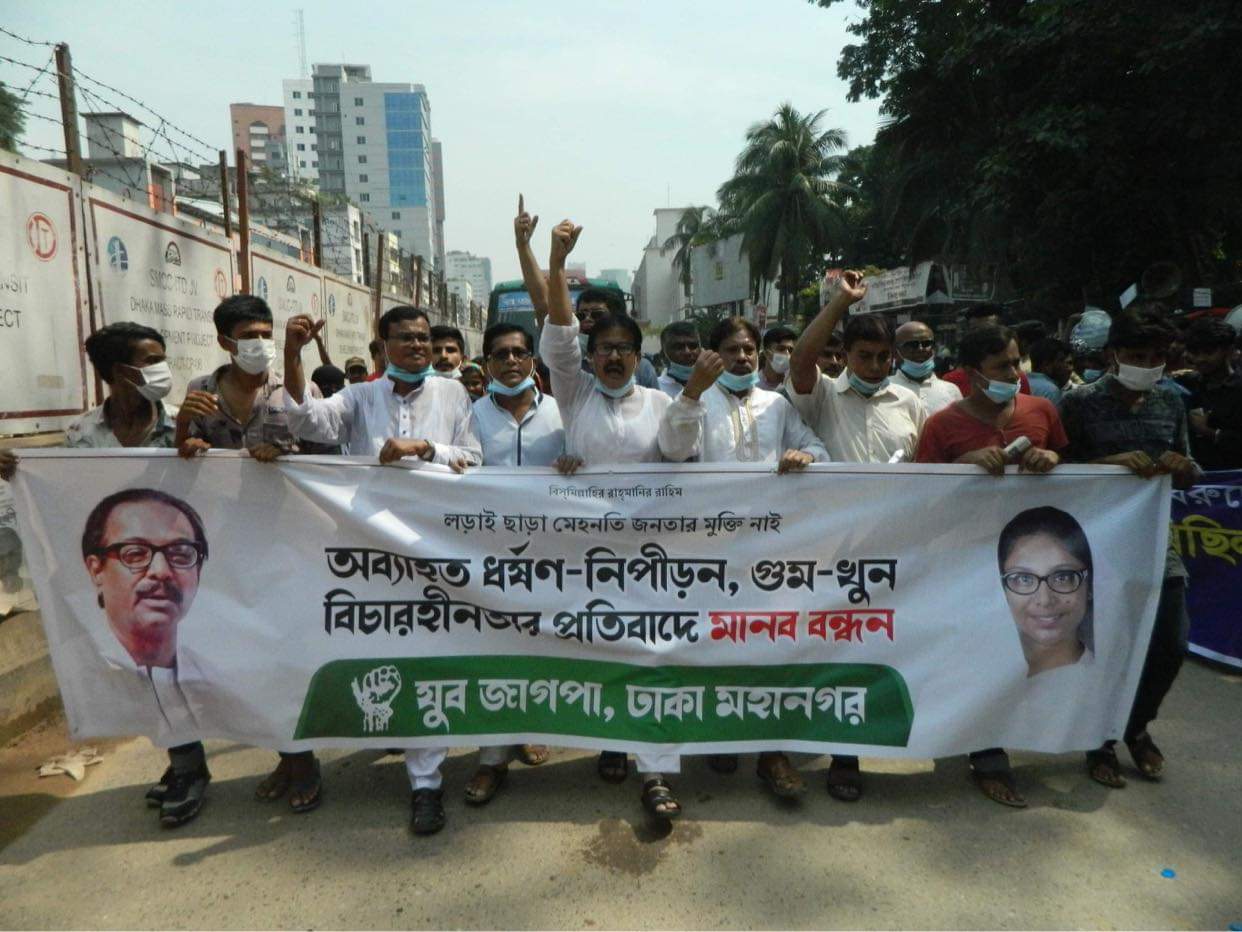 “অব্যাহত ধর্ষণ-নিপীড়ন, গুম-খুন ও বিচারহীনতার প্রতিবাদে” আজ ১৭ অক্টোবর ২০২০ (শনিবার) সকাল ১০ টায় প্রেসক্লাবের সামনে, যুব জাগপা-ঢাকা মহানগর আয়োজিত মানব বন্ধন অনুষ্ঠিত হয়।